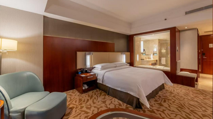 豪华房面积42平米宽敞客房,采用经典现代化设计。房内设施一应俱全:55英寸液晶电视、无线上网服务。花洒与浴缸设计独特,搭配特选沐浴产品,带来非凡体验。酒店免费提供恒温游泳池及健身房,让您活力满满。