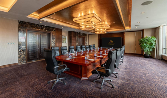 The 8-meter-high 1,600 square meter grand banquet hall on the second floor of the hotel features high ceilings and no columns to create a strong sense of space and magnificence. Modern, elegant and luxurious, the hall can accommodate 800 to 1,000 people for a cocktail party under sparkling crystal chandeliers. The hall can be divided as needed into three independent smaller banquet halls to meet diverse requirements. Equipped with a large service elevator that can transport cars, the hall is also ideal for holding an auto show. Additionally, the space has a unique entrance designed with a balcony where you can overlook the landscape through floor-to-ceiling windows.